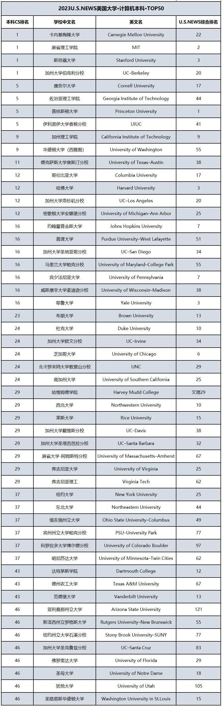 上述大学均位于综合排名TOP50,但CS排名都在50名之外,甚至一些排八九十名。如果比较在意专业排名,要认真考虑一下。整体排名信息汇总如下: