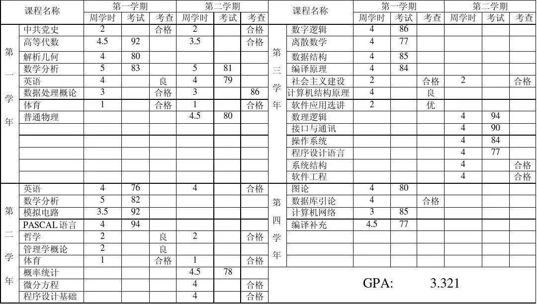 其中:X 为课程分数, 100分绩点为 4.00,60分绩点为 1.00,60 分以下绩点为0。