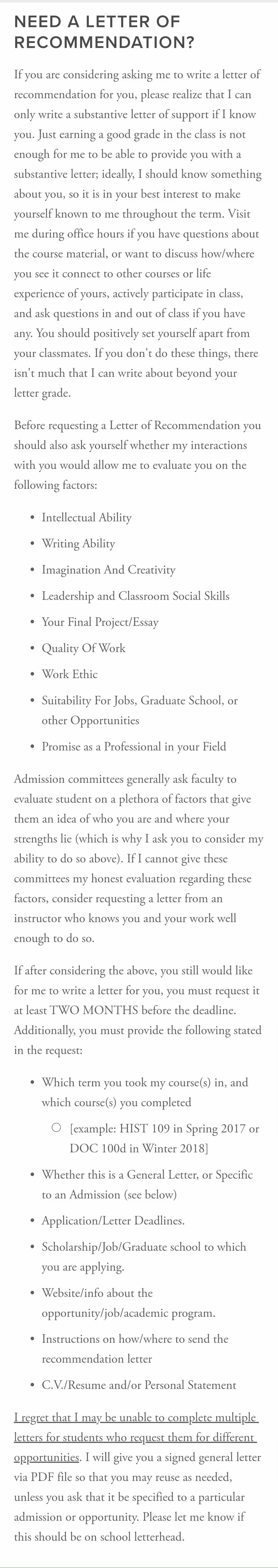 Just earning a good grade in the class is not enough for me to be able to provide you with a substantive letter; ideally, I should know something about you, so it is in your best interest to make yourself known to me throughout the term. Visit me during office hours if you have questions about the course material, or want to discuss how/where you see it connect to other courses or life experience of yours, actively participate in class, and ask questions in and out of class if you have any. You should positively set yourself apart from your classmates. If you don't do these things, there isn't much that I can write about beyond your letter grade.