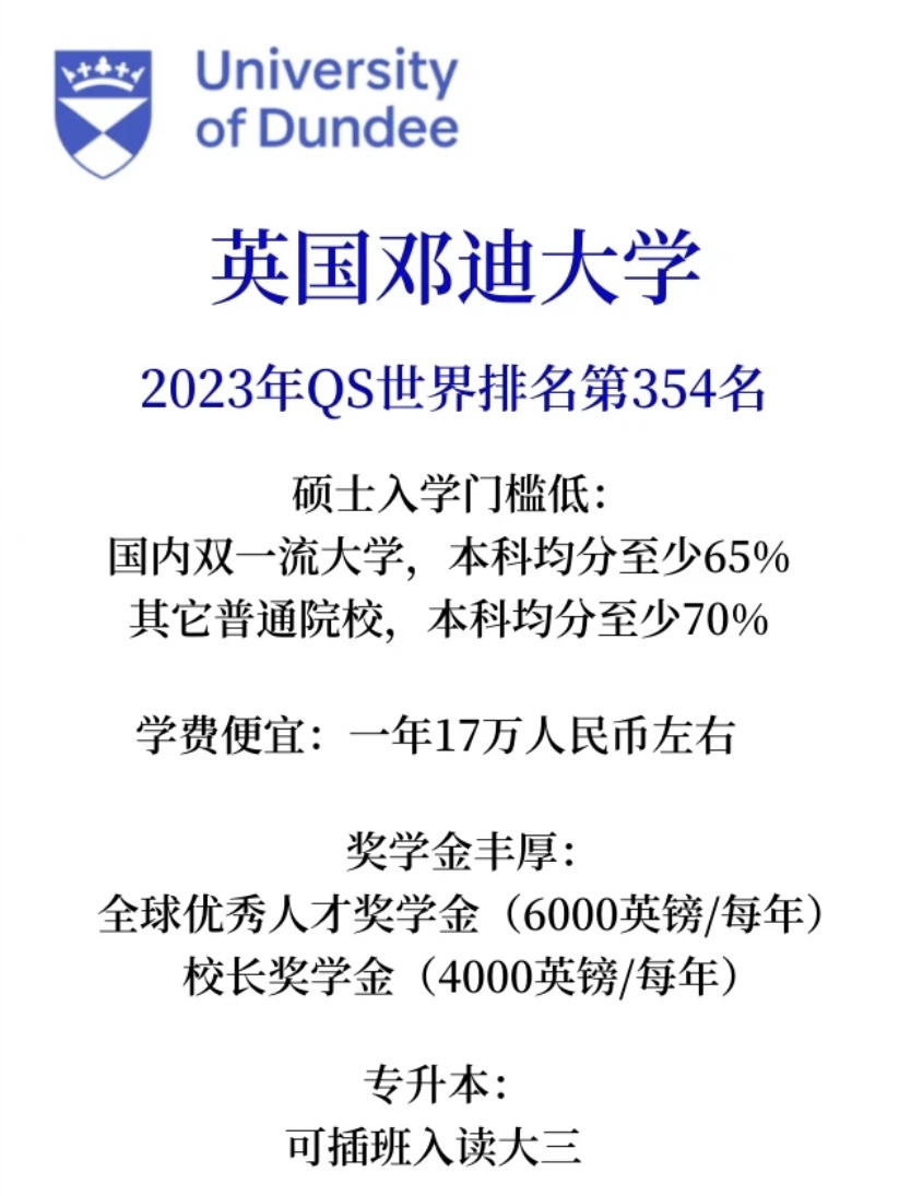 邓迪大学硕士入学条件,门槛低,学费便宜,对本科院校要求不高,同时国际学生还可以申请丰厚的奖学金,对专升本的学生也非常友好,可以插班入读本科大三,一年时间拿到英国名校的本科学位,硕士也是一年时间,短时间完成学历的快速过度。
