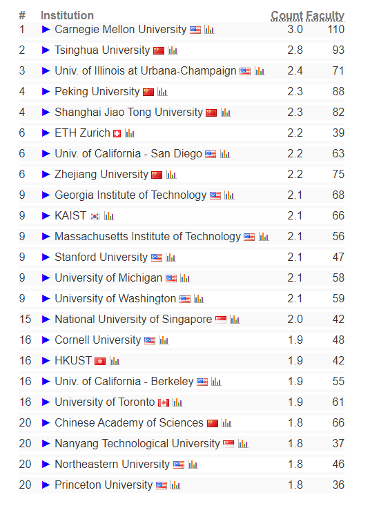 该领域中, 卡内基梅隆大学 独占鳌头,麻省理工学院、斯坦福大学分列二三。