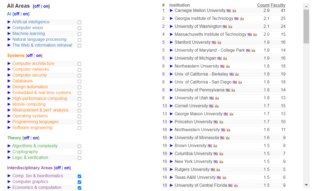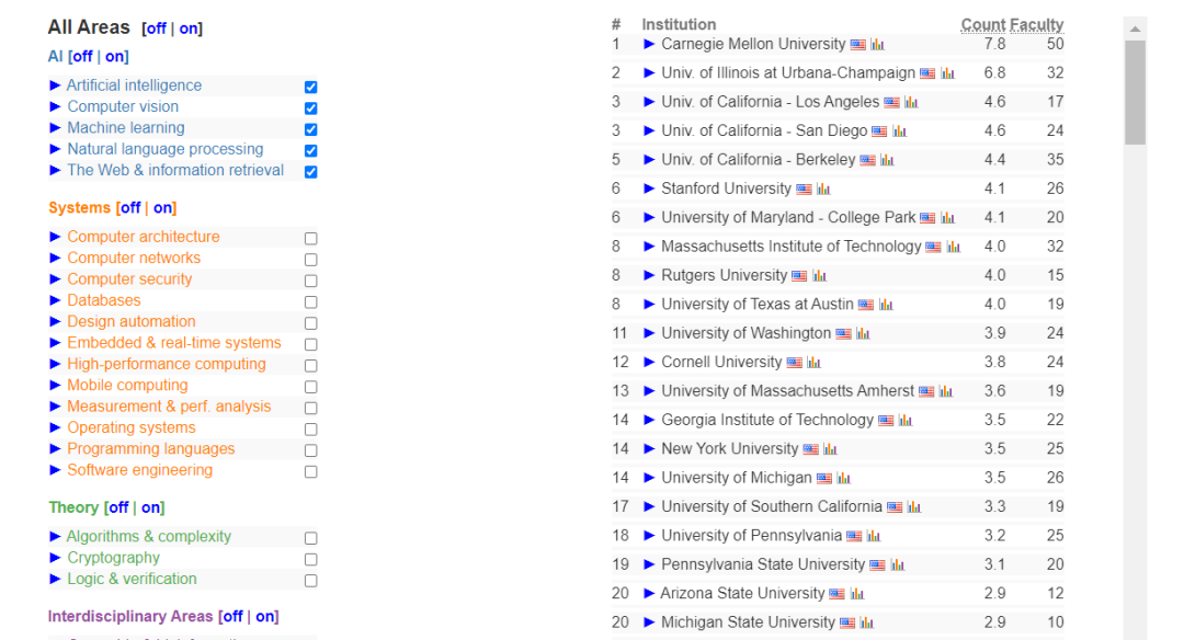 该领域前三名令人毫不意外, 卡内基梅隆大学与伊利诺伊大学香槟分校 共享第一,佐治亚理工学院与加州大学圣地亚哥并列第三。加州大学河滨分校高居第五位,与加州系统中的欧文分校和圣芭芭拉分校,以及普渡大学、密歇根大学、威斯康辛大学麦迪逊分校并列。