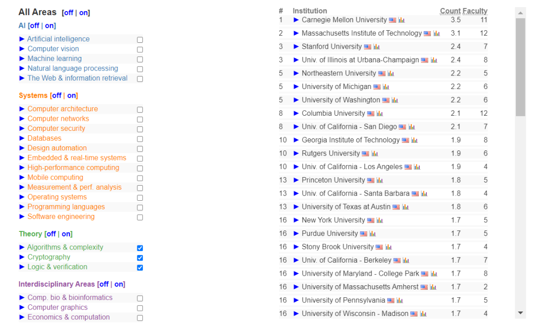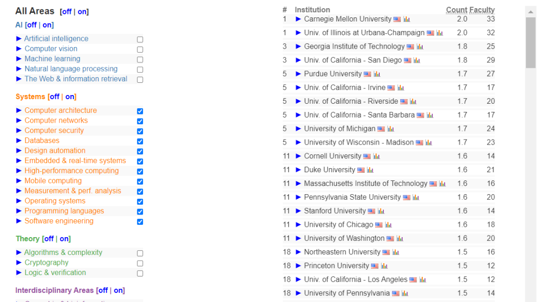CS RankingCS所有的研究主题归类为以下四个大方向,可通过勾选查看不同方向下的排名情况: