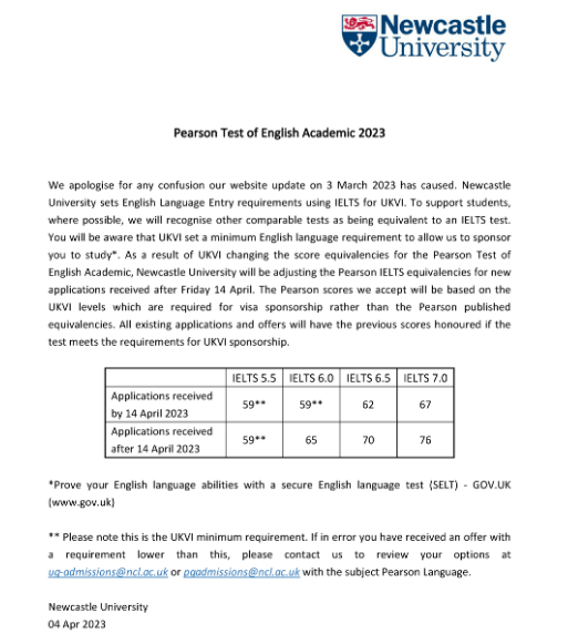 2023年4月14日后递交学位申请的学生,PTE按照新的入学要求。