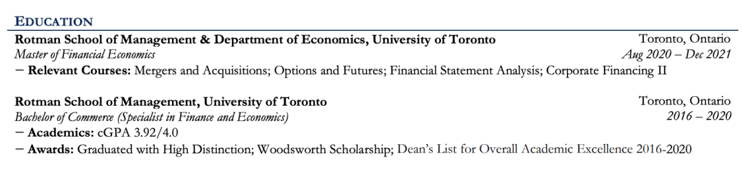 本科3.9+的GPA,CFA Level 1也是标配,各类必备行业证书和对应加拿大实习,同时还是学校投资俱乐部的优秀Participant。