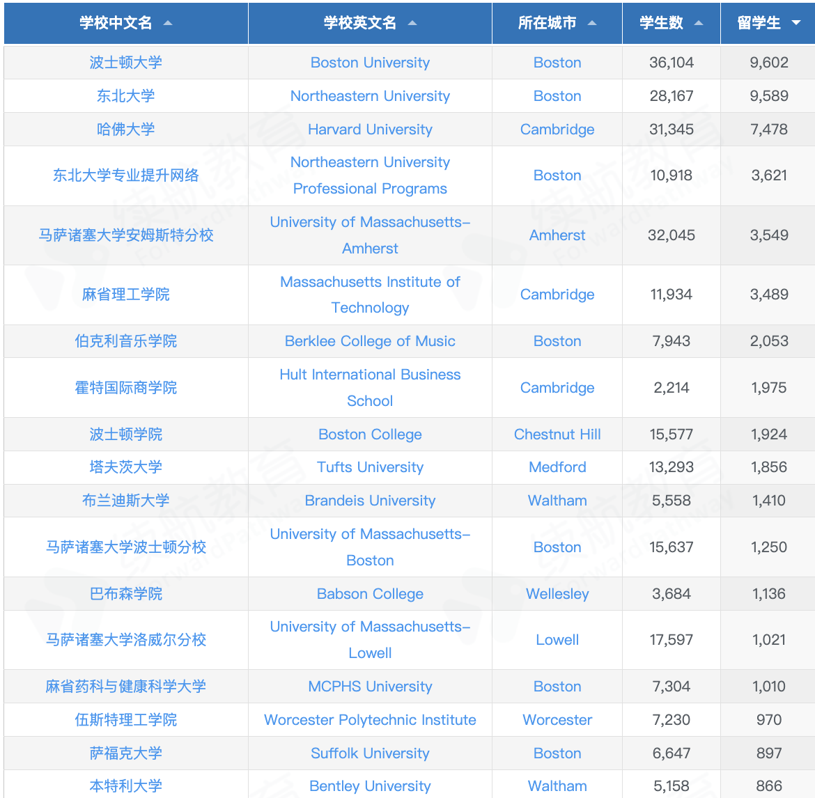 U.S. News美国大学排名前十名的学校有两所都在马萨诸塞州,这两所学校分别为哈佛大学(Harvard University)和麻省理工学院(Massachusetts Institute of Technology)。该州还有几所知名的文理学院,例如威廉姆斯学院(Williams College)、安默斯特学院(Amherst College)、卫斯理学院(Wellesley College)、史密斯学院(Smith College)。如果你想学音乐,马萨诸塞州的伯克利音乐学院也是一个不错的选择。总之,马萨诸塞州高校林立,教育氛围十分浓厚。下面我们就一起来看看关于留学生的最新数据以及排名吧!