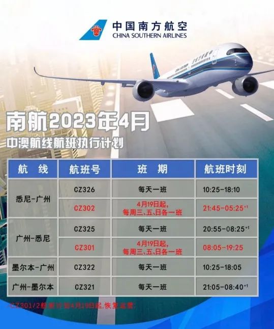 南航公布了中澳航线2023年4月计划执行的航班信息。 在这份航班信息表中,大家可以非常惊喜地发现,下个月开始中澳又要增开新航班了! 4月19日起, 南航计划恢复悉尼-广州航线CZ301/2航班运营, 目前计划每周三、五、日各一班。