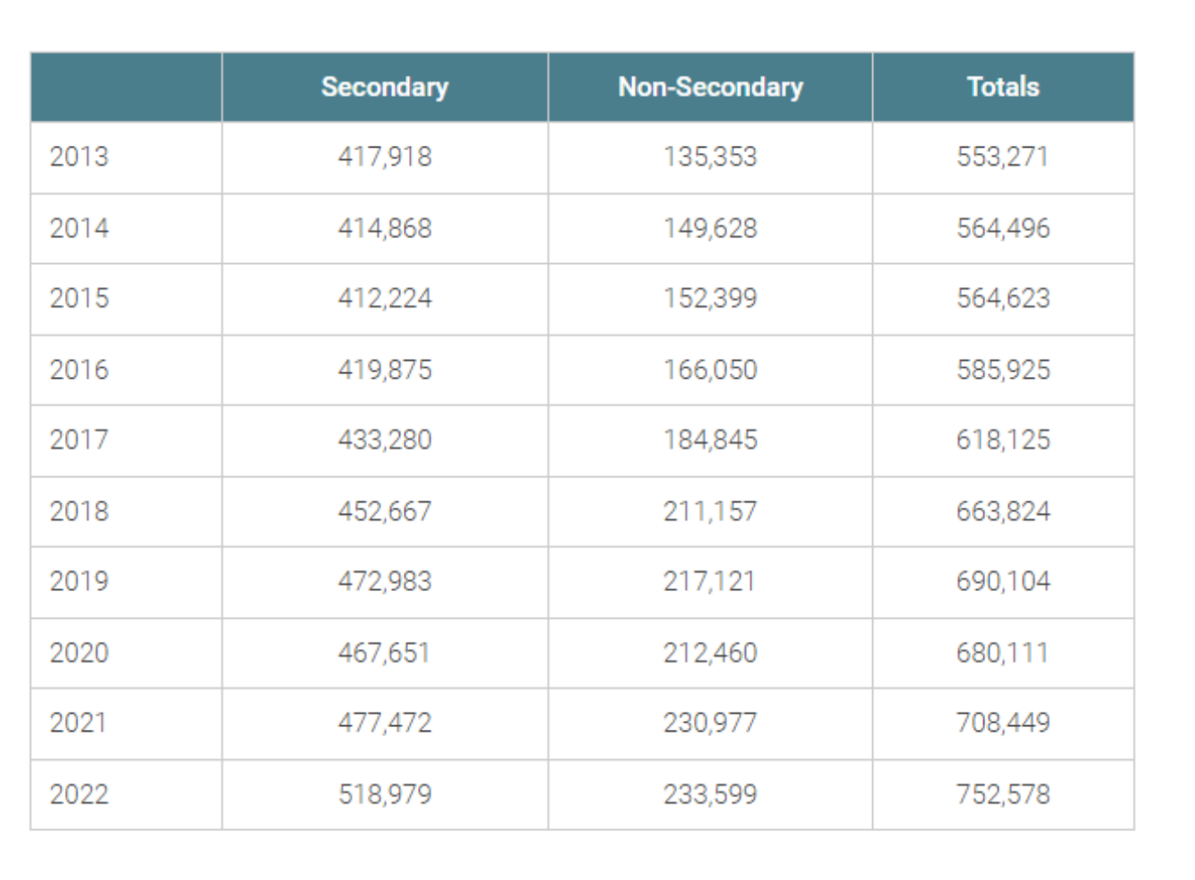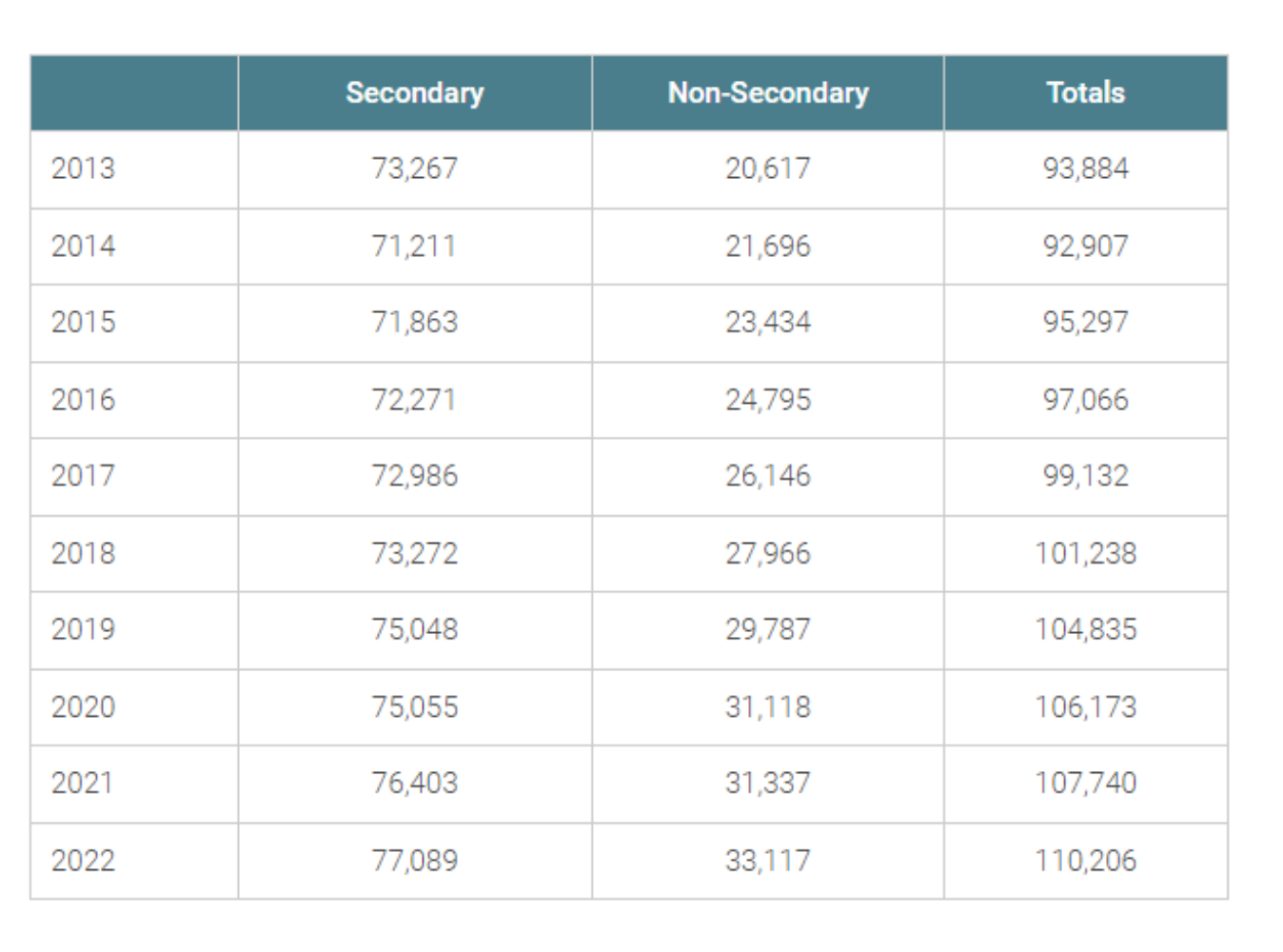 可以看到,2022年安省总申请人为164224人,较2021年申请人数有小幅度上升,其中92420人来自安省101通道学生,71804人来自外省和外国105通道(105通道还包括一些大学转学生)。