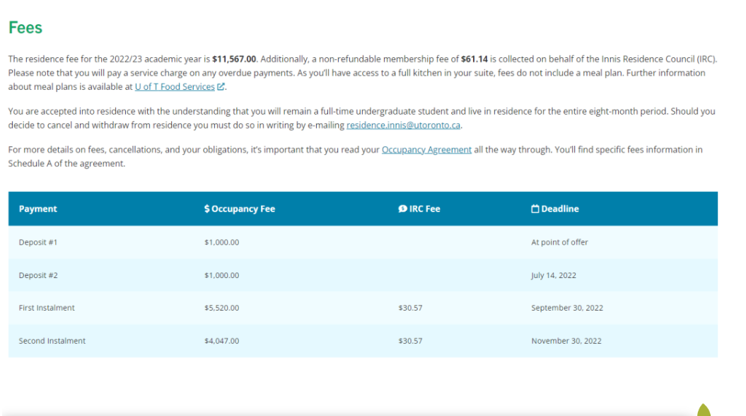 Innis 一学年的费用是11567加币以及一个61.14加币的不退费的会员费 :