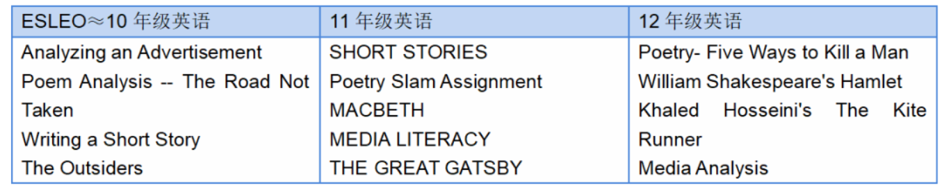 我们先从ESL课程的等级和加拿大中学英语课的衔接来了解,以安大略省中学为例,ESL分为5级,学生在入学的时候进行英语水平测试,按测试结果分到不同的等级开始学习,每个等级就是1门课程,到了ESLDO和ESLEO分别对等的是9年级英语和10年级英语,完成ESLEO后可以直接衔接11年级英语。