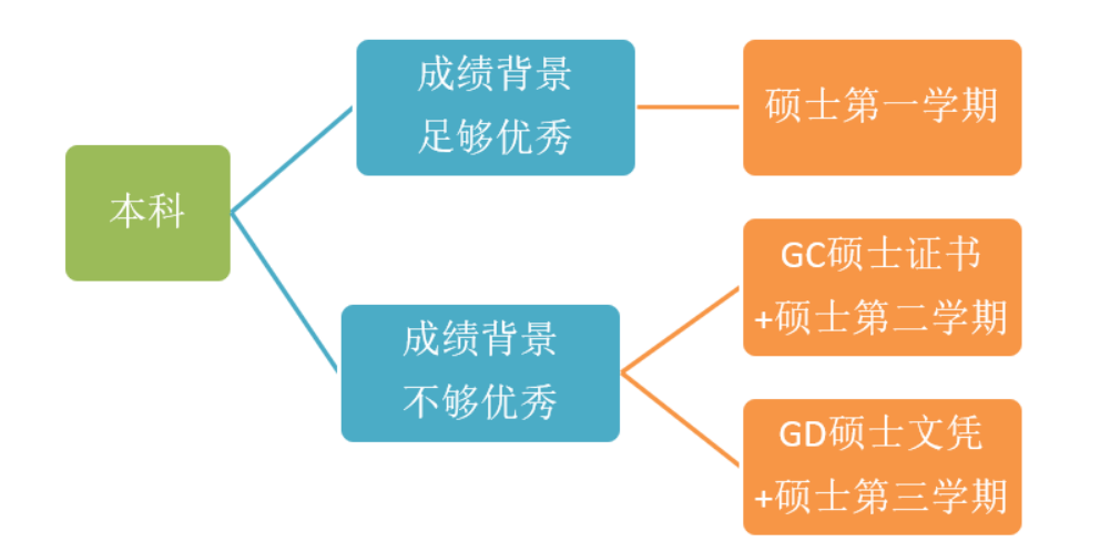 通过入学后在校内的努力学习,如果学生达到大学要求的分数,就可以通过减免学分继续衔接硕士主课。GC和GD学习的内容实际上就是硕士第一学期和前二个学期的内容,所以如果顺利升入硕士课程,最终的毕业时间和毕业证书是一样的。