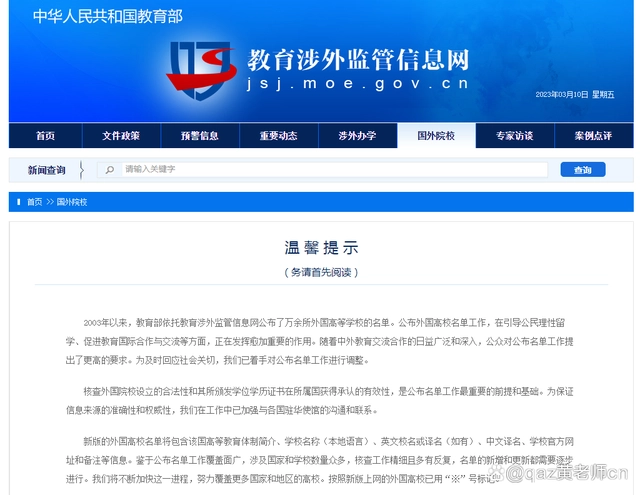 为帮助自费出国留学人员正确选择国外学习学校,加强对自费留学中介活动的监管,引导自费留学中介机构与国外正规学校开展合作,教育部通过教育部教育涉外监管信息网(www.jsj.edu.cn)和中国留学网(www.cscse.edu.cn)公布了44个我国公民主要留学国家1万多所学校名单,基本涵盖了我国公民主要留学目的地国的正规高等学校。