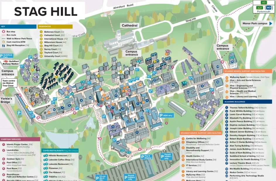 Manor Park离学校步行20分钟坐车10分钟,距离Surrey Sports Park(内有健身房,球场,泳池等)和Tesco(吉尔福德的大型超市)非常近;