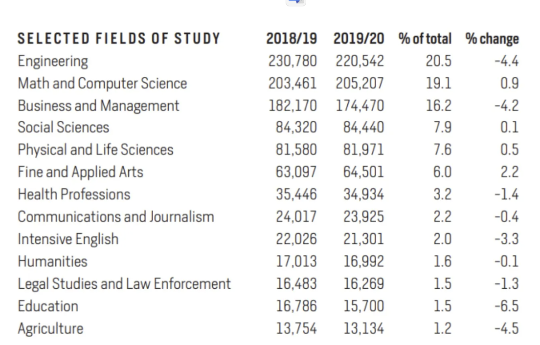 工程专业依旧第一,但人数下降4.4%,为220,542人。