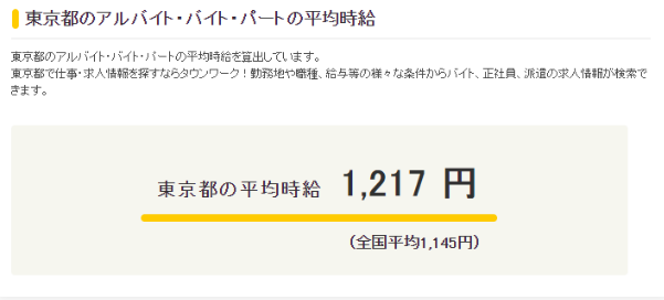 根据タウンワーク2022年4月14日的最新统计,东京地区现在的平均时给是1217日元,全日本平均时给是1145日元。东京真不愧是东京。