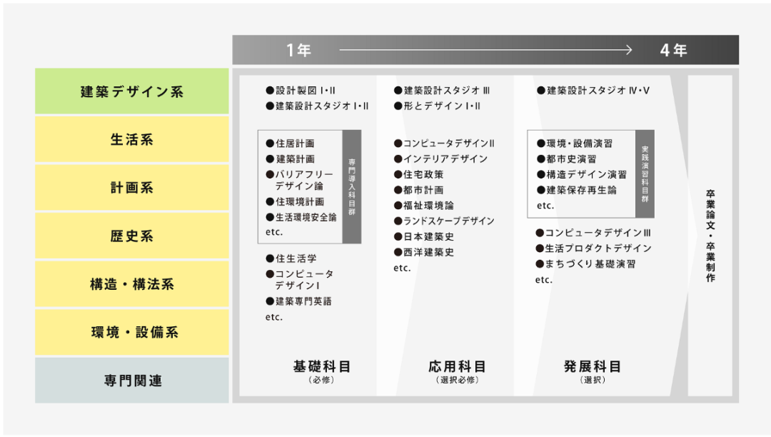 根据学生的兴趣和未来目标,在建筑领域开发多样化的课程 以取得建筑师入学考试资格(1级、2级、木结构)为目的, 实行高标准的建筑设计教育 其他高校的建筑学部、建筑系,很多都是以工程系为基础,而日本女子大学新设的建筑设计学部(暂定名)则是以家政学部的住房学科为基础,与居住生活相关的丰富的学科内容,融合工学部技术层面的内容,是家政学和工学的复合学科。