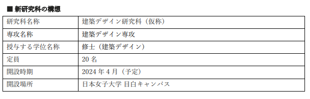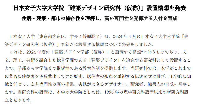 大学发表了2024年4月新设立日本女子大学研究生院“建筑设计研究科(暂称)”的计划。作为面向2024年度开设准备中的「建筑设计学部(暂称)」继续学习的场所,计划在大学院新设有持续性的研究科。“建筑设计”是研究融合人文、理工、艺术的综合学科。