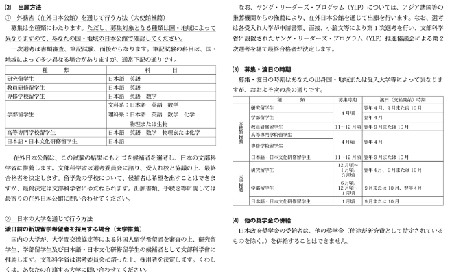 国内大学根据校际交流协定等对外国留学生进行审查后向文部科学省推荐。文部科学省在征求评选委员会的意见后,决定录用人选。
