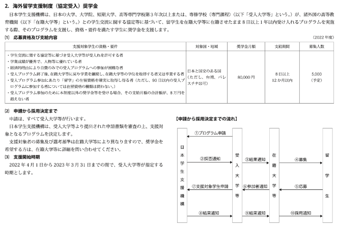 申请方式:申请全部由接收大学等进行;日本学生支援机构在审查接收大学提交的申请材料后,决定支援对象项目。
