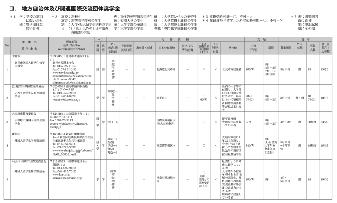 由26个地方自治体以及37个地方国际交流团体提供各种奖学金,几乎涵盖了全日本。