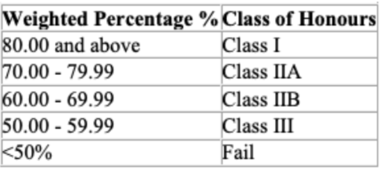 从AQF可以看出,荣誉学士学位(Honours)要比普通学士学位(Bachelor)高一级,比硕士课程(Master)低一级。因此,荣誉学士学位申请门槛要比一般学士学位高。一般只录取前25%的本科学生。学生在完成学业后,将根据成绩最终划分为以下等级: