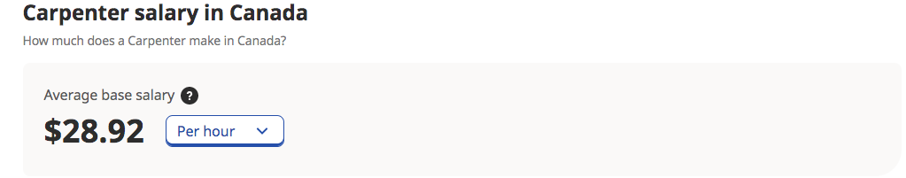 根据indeed的薪酬调查数据显示,木工在加拿大的平均时薪高达CAD$28.92。