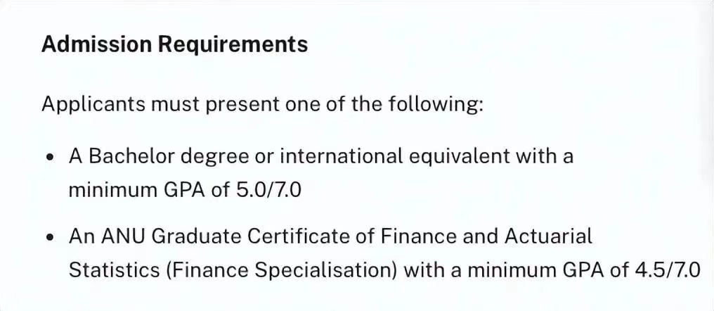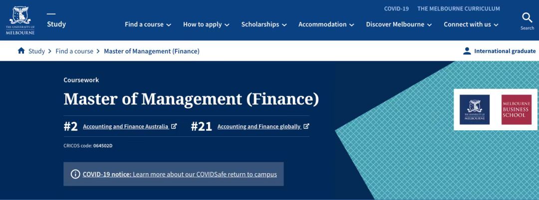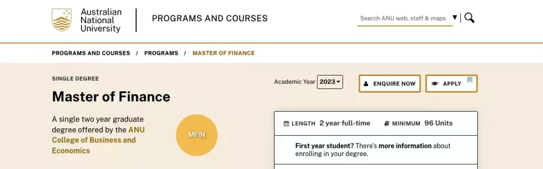 ANU的商科排名常年在澳大利亚名列前茅,其金融硕士(Master of Finance)课程不要求申请者有相关的本科背景,因此对跨专业申请的学生十分友好。
