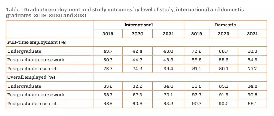 报告数据显示,2021年无论是澳洲国内还是国际毕业生,就业率没有进一步下降。