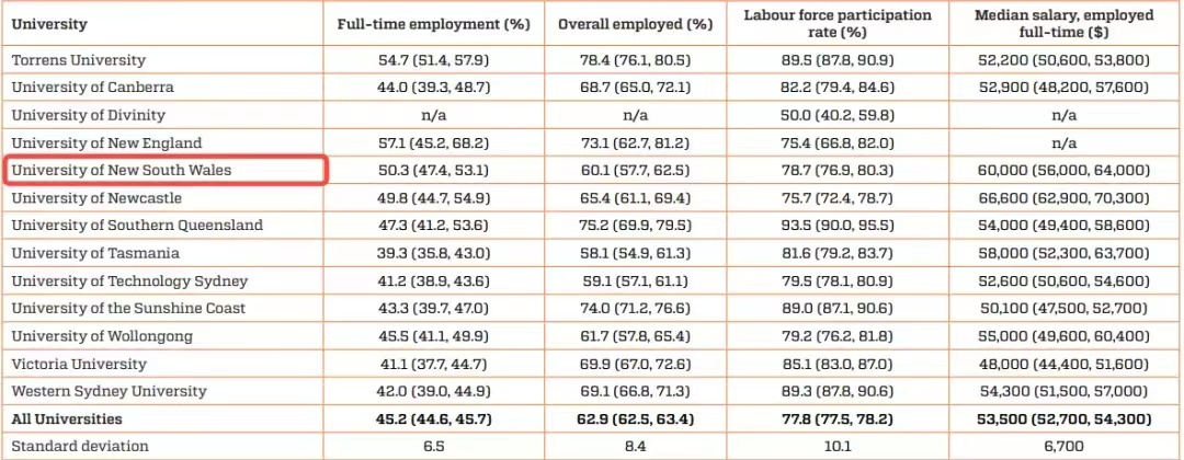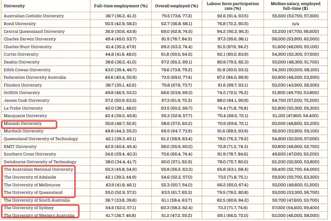 UQ是澳洲八大中全职就业率偏高的大学,悉尼大学紧随其后,这也与悉大的毕业生有出色的就业能力相吻合。八大中最低的是阿德莱德大学,而墨尔本大学的全职就业率为43.9%,也远低于其他八大。