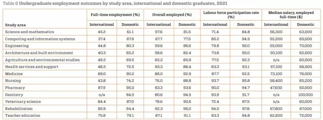 就本科生而言,国际全职就业率从医学专业毕业生的89.0%到创意艺术专业毕业生的35.1%不等。一般来说,国际和澳洲国内毕业生的全职就业率相对较高的教育领域,如药学、康复、医学和兽医科学,是相似的。