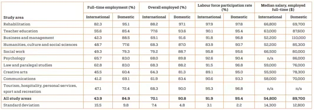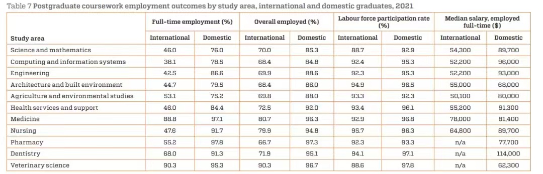 而对研究生来说,全职就业率从兽医科学的90.3%到计算机和信息系统的38.1%不等。与本科生一样,全日制就业率相对较高的教育领域,如药学、医学、兽医科学、康复和牙科,对国际和澳洲国内毕业生来说都是相似的。