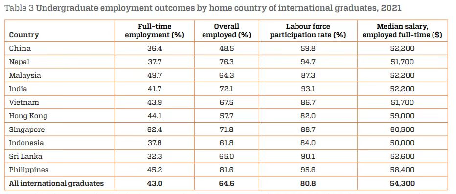 在这最大的10个来源国中,来自新加坡的本科毕业生全职就业率高达62.4%,斯里兰卡毕业生的全职就业率为32.3%,而中国的毕业生全职就业率仅高于斯里兰卡,还没有达到所有国际毕业生的平均值。
