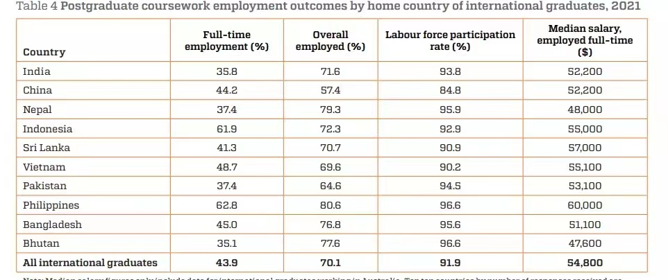 报告也展示了来自不同国家的国际毕业生在澳洲完成学业后的的就业差异。