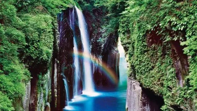 宫崎地区的高千穂峡是12万年前阿苏火山活动时,熔岩流入五赖川形成的峡谷。谷底很深,岩石象被切割一般笔直,泛舟湖上可以欣赏大两岸旖旎风光。峡谷最深处高达100米,溪水流下山谷形成美丽的瀑布。