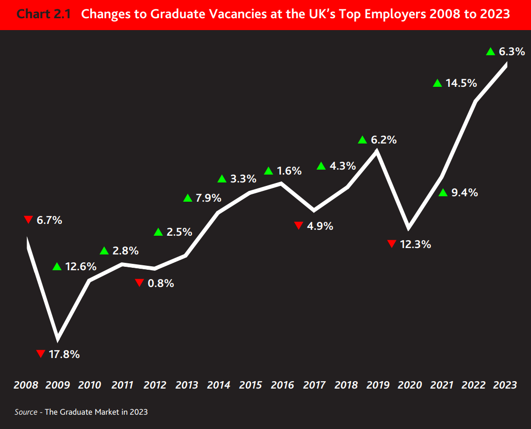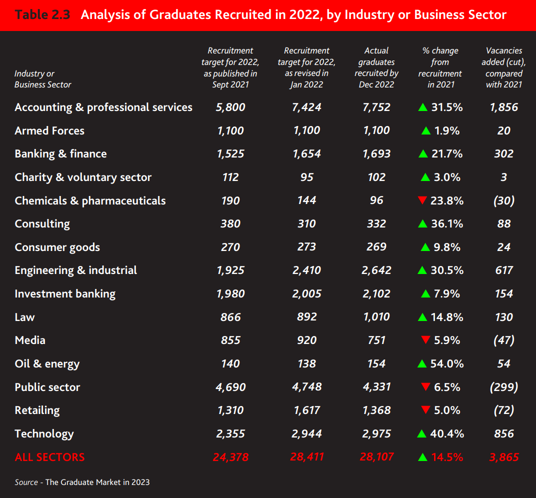 据《报告》显示,与2021年相⽐,英国顶级雇主在2022年招聘的毕业⽣⼈数增⻓了14.5%,比预期增加了将近3,500人。