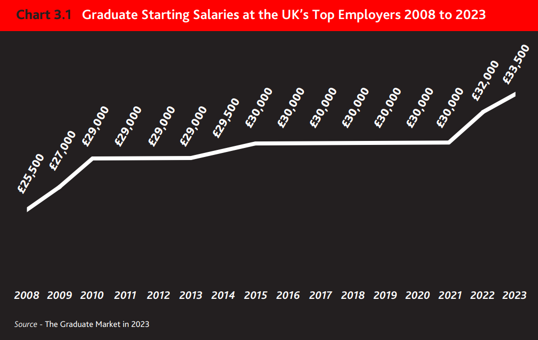 但从2021年起,毕业生起薪已连续两年增长,预计在2023年,毕业生起薪将达到33,500英镑。