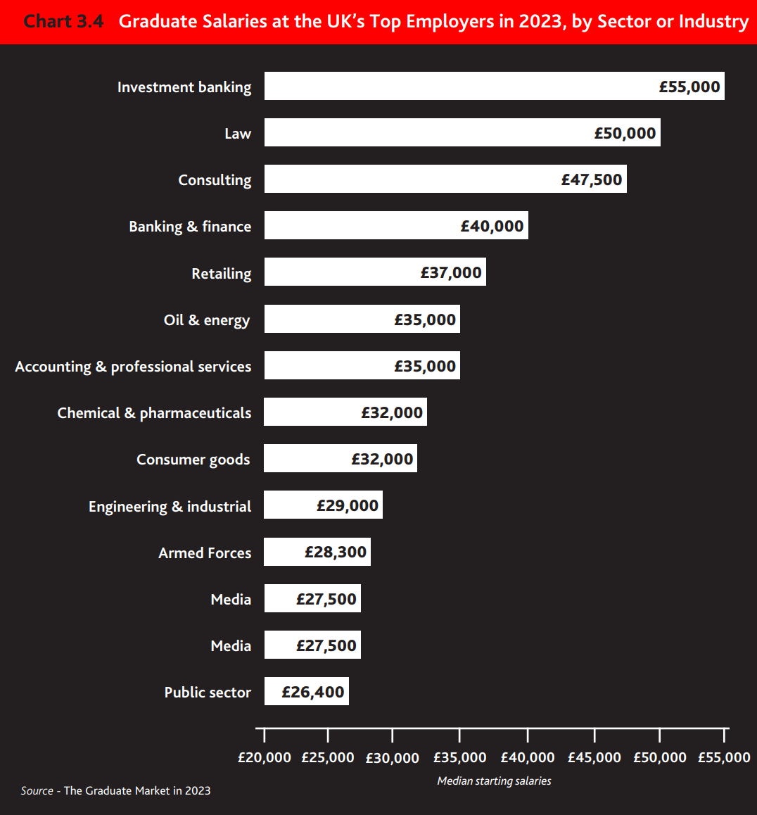 其中,以给到的起薪中位数来看,排名前三的行业分别为投资银⾏(55,000英镑)、法律( 50,000英镑)以及咨询(47,500英镑)。