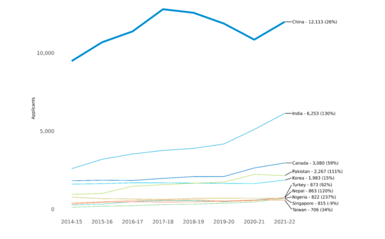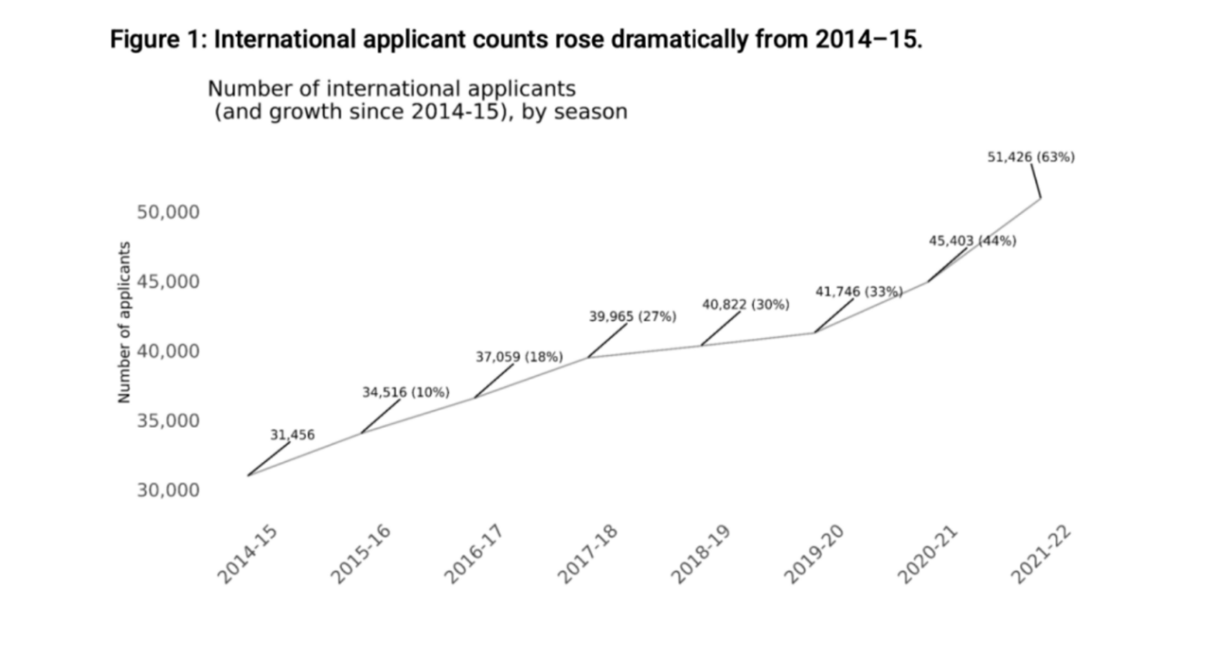 报告显示,从2020-2021学年开始,美本的国际申请者增长就开始起飞。先是同比前一年上升11%,2021-2022年更是上涨了19%。2023年度的国际生申请人数再次呈现增长趋势。