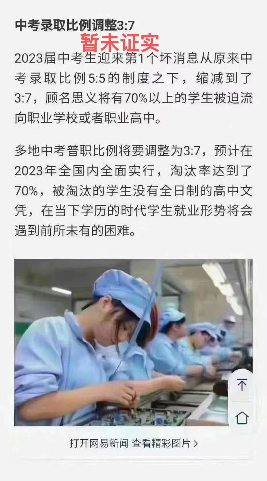 日前网上有消息透露:中考普职录取比例由原来的5:5调整为7:3。顾名思义将有70%以上的学生被迫流向职业学校或者职业高中。