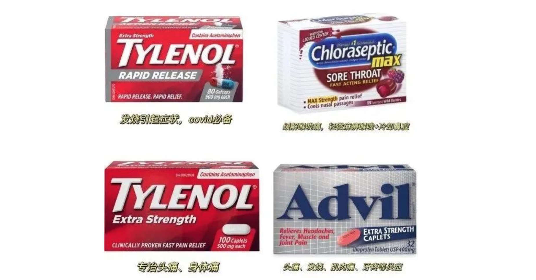 泰诺、Advil、Motrin等内服感冒药均有缓解疼痛作用。除此之外,还有部分外涂药物也有缓解疼痛的效果。