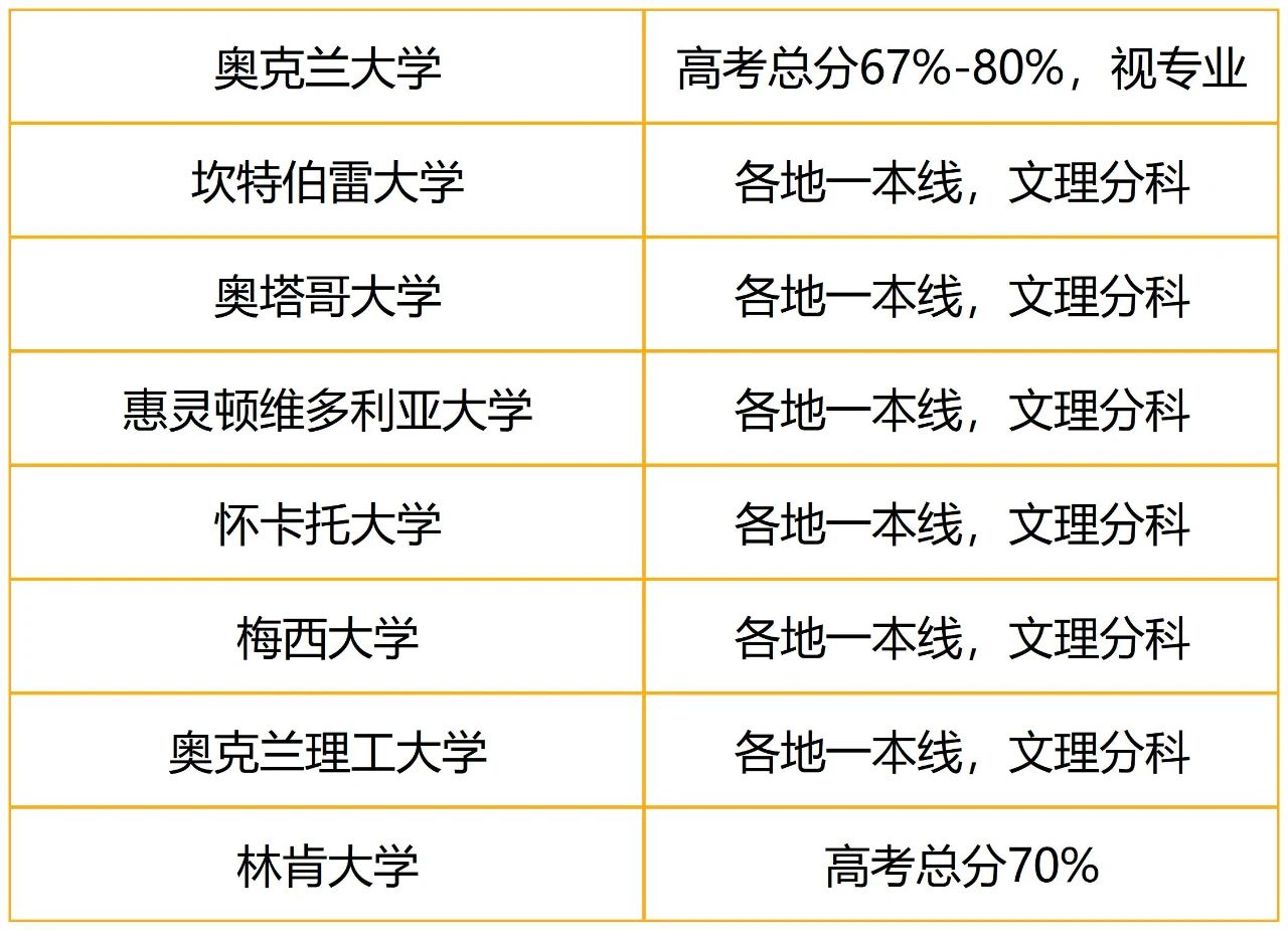 当前,新西兰八所国立大学对中国高考学生的录取分数线如下: