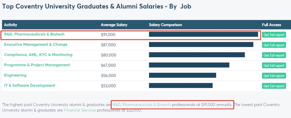 比如考文垂大学,在其所有毕业生中薪水最高的是研发、制药和生物技术专业,年薪为$91,000。