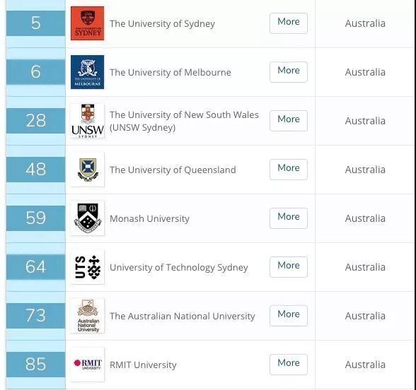 除了悉尼大学和墨尔本大学,澳洲还有另外 6所高校跻身前100 ,分别是新南威尔士大学排在第 28名,昆士兰大学排在第48名,莫纳什大学排在第59名,悉尼科技大学排在第64名,澳大利亚国立大学排名第73,RMIT排名第85。
