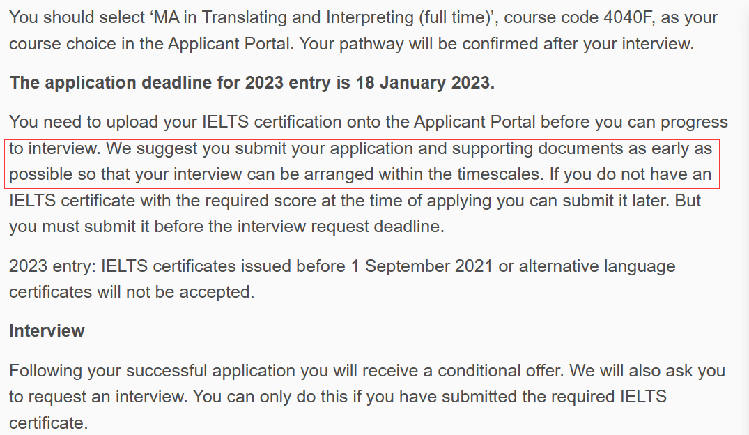 从 Translating and Interpreting MA 可以看到,尽早提交雅思尽早安排面试。
