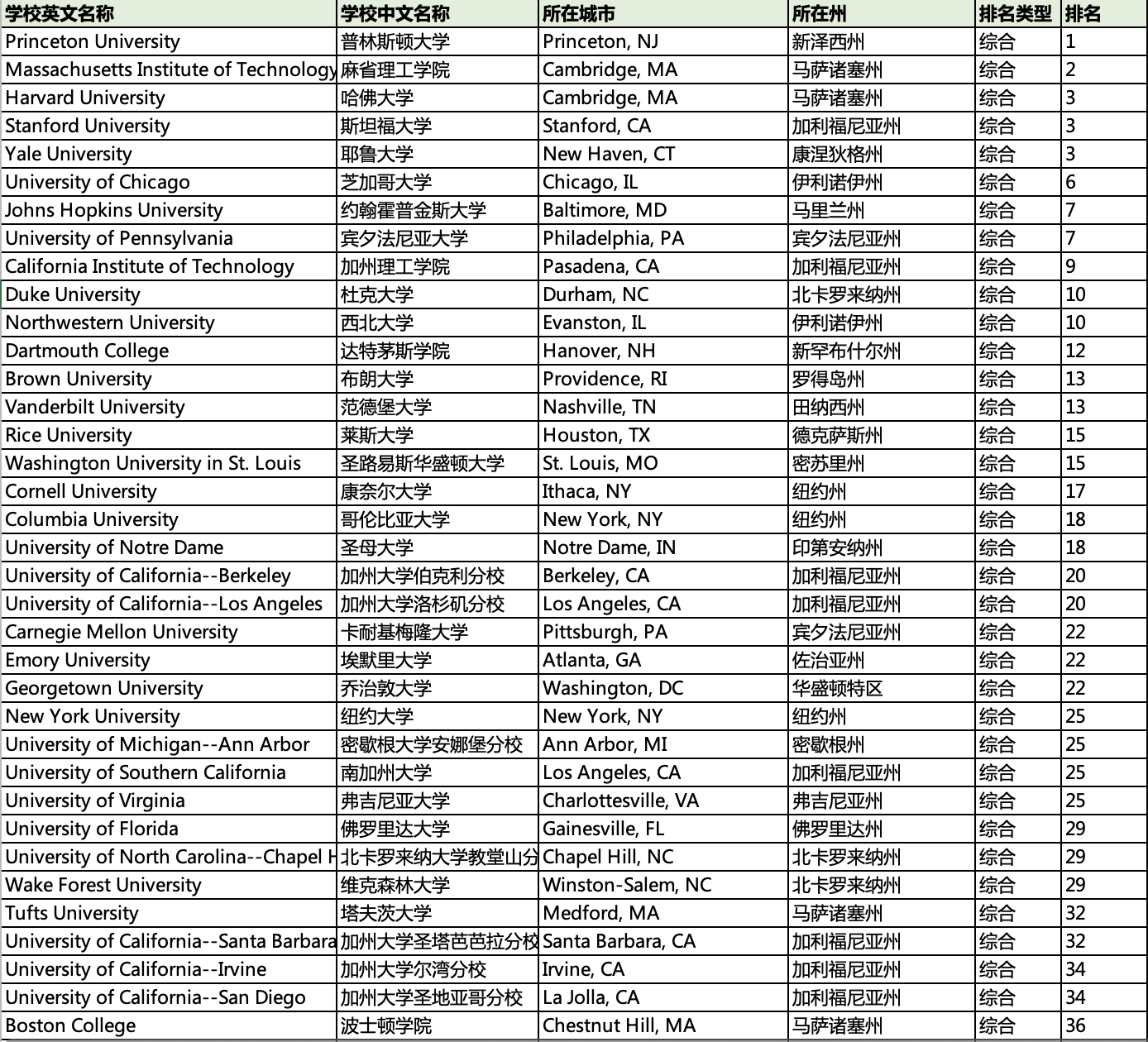 美国院校排名2023