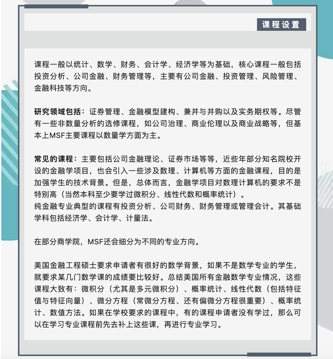课程一般以统计、数学、财务、会计学、经济学等为基础,核心课程一般包括投资分析、公司金融、财务管理等,主要有公司金融、投资管理、风险管理、金融科技等方向。