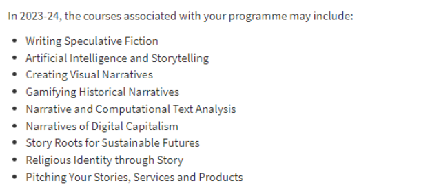 另外,学生还可以在核心课程之外自由选择其他相关课程进修,这些课程每年并不固定,2023-24学年的课程包括: