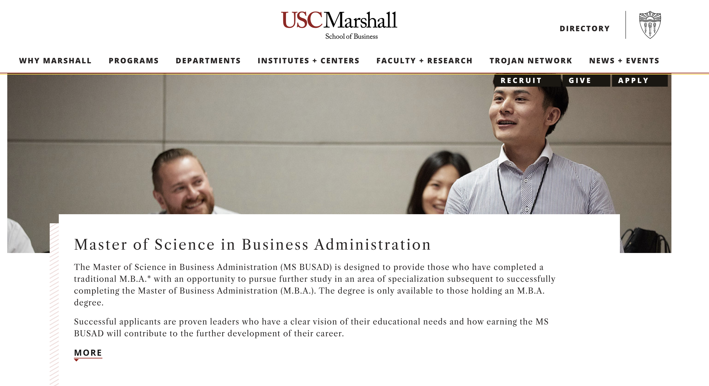 在提交申请时,申请人必须确定一个感兴趣的领域,特别是将马歇尔的一个学术部门命名为他们的研究重点。马歇尔的学术部门包括:商业传播、商业创业、数据科学与运营、金融与商业经济学、管理与组织以及市场营销。建议申请人访问南加州大学课程表以了解最近和当前的课程。