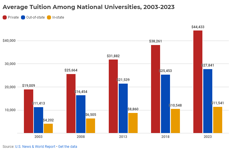 2003年到2023年,美国私立校学费平均上涨134%,公立校州外学费上涨141%,州内上涨175%。