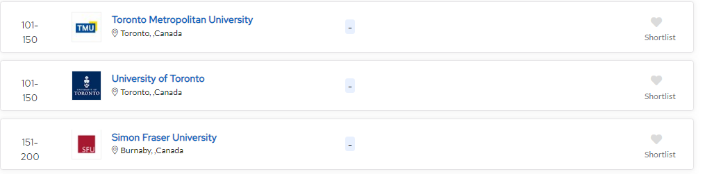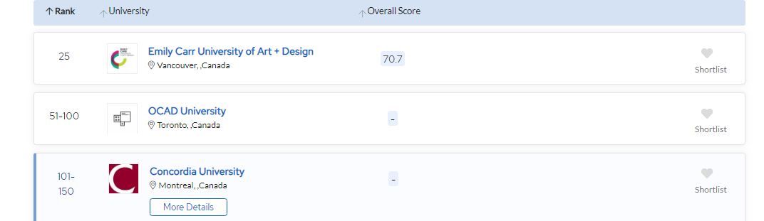加拿大艺术设计类院校前6名:艾米丽卡尔、安大略艺术与设计学院、康考迪亚大学、多伦多都会大学、多伦多大学、西蒙菲沙大学。